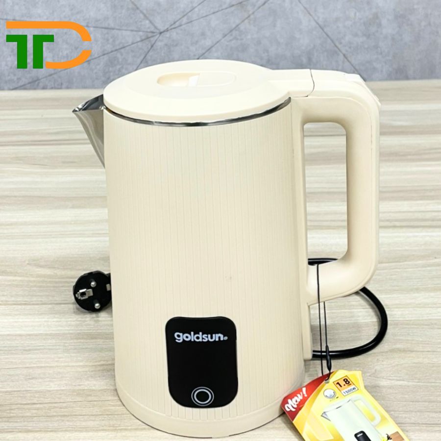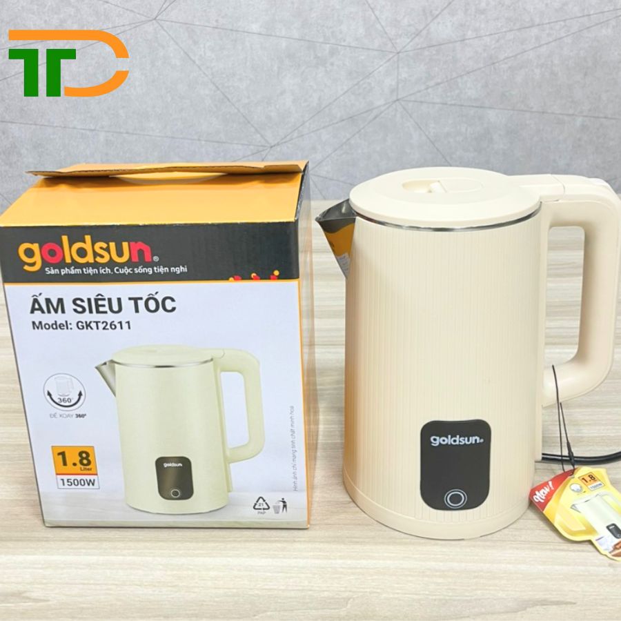 - Ấm đun siêu tốc Goldsun GKT2611 với thiết kế hiện đại, trang nhã, thân ấm 2 lớp bền đẹp.