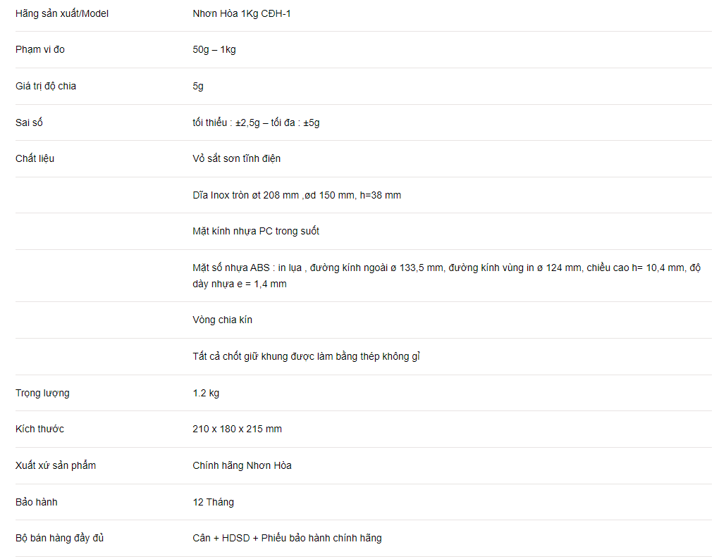 Cân đồng hồ lò xo Nhơn Hòa 1Kg CĐH-1 được sản xuất và kiểm soát dưới hệ thống quản lý chất lượng theo tiêu chuẩn ISO-9001, kiểm định xuất xưởng theo ĐLVN 30:2009, phù hợp OIML R76-1:2006 nên cân luôn đảm bảo độ chính xác cao và rất lâu bền khi sử dụng.