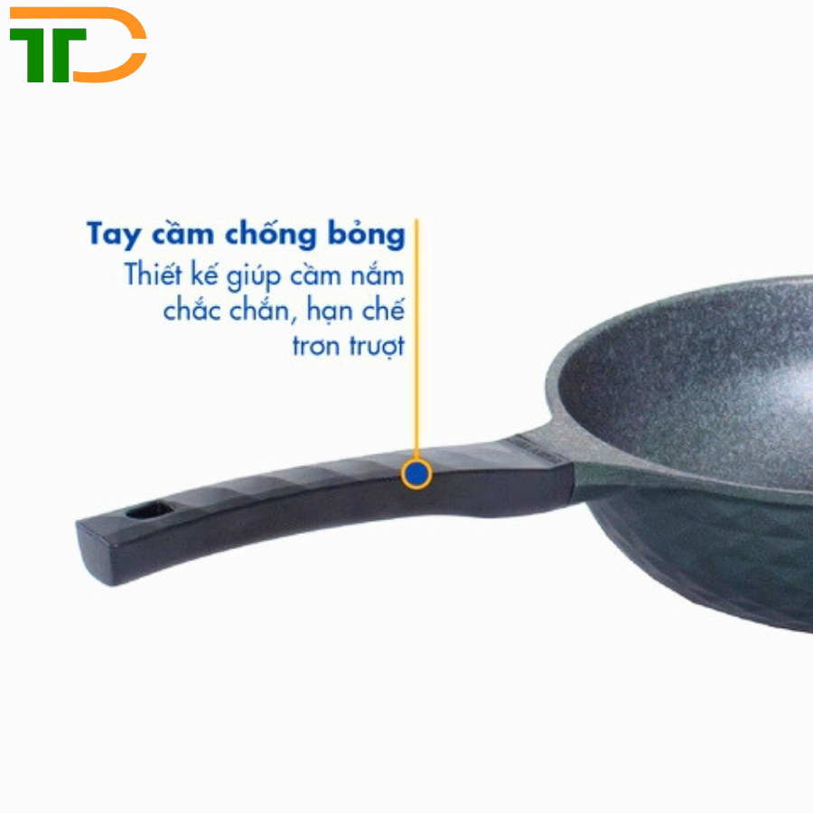 - Phần tay cầm chảo chống dính cũng được chăm chuốt kỹ lưỡng từ chất liệu nhựa cứng, chịu nhiệt, đến kiểu dáng tiện lợi, dễ cầm nắm, không sợ bị trượt ra khỏi tay khi đang nấu
