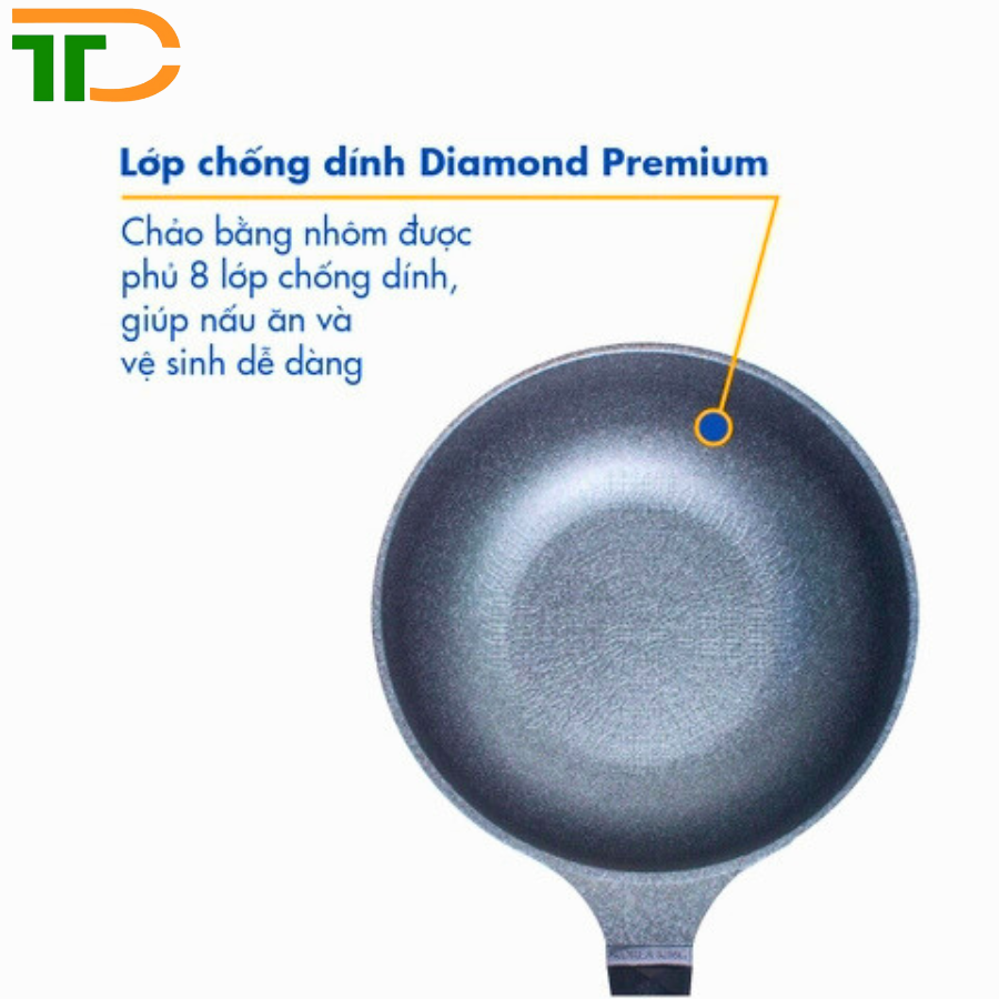 - Bên trong chảo được phủ lớp men chống dính kim cương lần đầu tiên có mặt Việt Nam. Với độ bền cao, khả năng chịu nhiệt tốt, tiết kiệm được thời gian và nhiên liệu, hạn chế dầu, mỡ khi nấu ăn, an toàn cho sức khỏe
