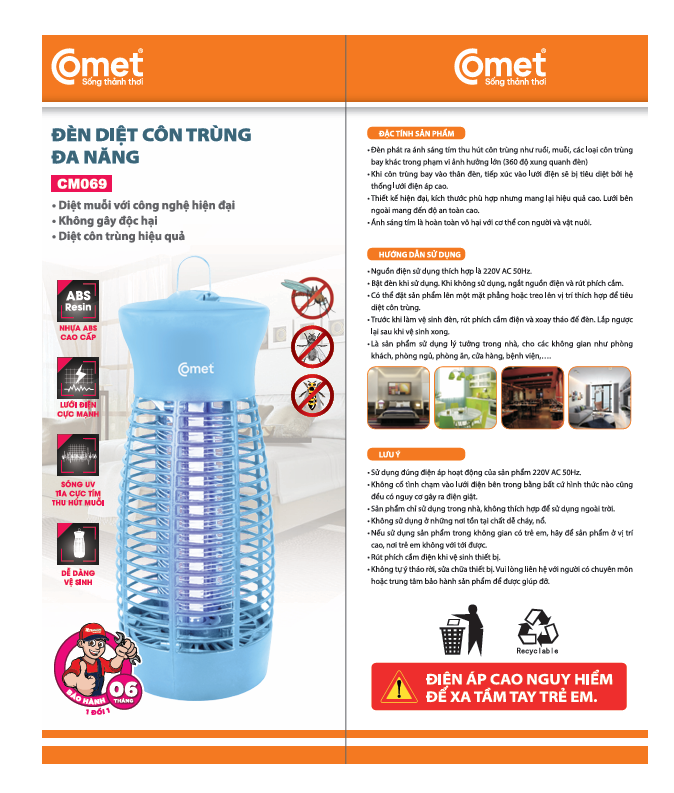 Theo nghiên cứu khoa học, các loài côn trùng dễ bị thu hút bởi các nguồn sáng, đặc biệt là nguồn sáng có màu lạnh. Lợi dụng đặc tính này, Đèn diệt côn trùng đa năng Comet CM069 sẽ phát ra một chùm ánh sáng tím với bước sóng lớn, chùm sáng được chiếu ra 360 độ xung quanh. Ánh sáng này sẽ thu hút các loại côn trùng như ruồi, muỗi và nhiều loại côn trùng bay khác bay vào đến bên trong đèn. Khi vào trong, chúng sẽ bị quạt gió hút xuống và chạm vào lưới điện có điện áp cao đến 220V và bị tiêu diệt. Với cơ chế này, đèn sẽ có thể thu hút và diệt côn trùng hiệu quả trong diện tích từ 15 đến 20m2, tương đương với diện tích của phòng khách hoặc phòng ngủ rộng.