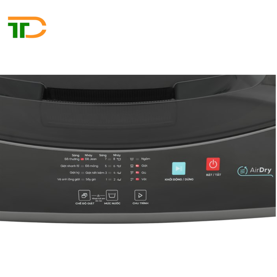 - Chế độ sấy gió AirDry: Được thiết kế lỗ hút gió thông minh nằm ở phần nắp máy, tạo điều kiện cho luồng gió đi vào mạnh mẽ trong suốt quá trình lồng giặt đang quay siêu tốc. Nhờ đó, quần áo sau khi giặt trở nên ráo nước hơn và giảm bớt thời gian phơi khô đáng kể.
