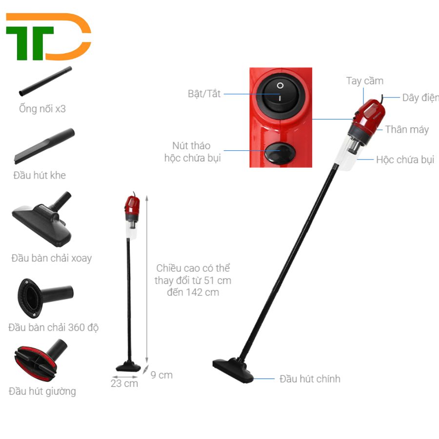 Với dây điện dài 5m, bạn có thể dễ dàng hút bụi ở nhiều khu vực mà không cần liên tục thay đổi ổ cắm. Thiết kế này mang lại sự tiện lợi khi vệ sinh trong không gian rộng lớn.