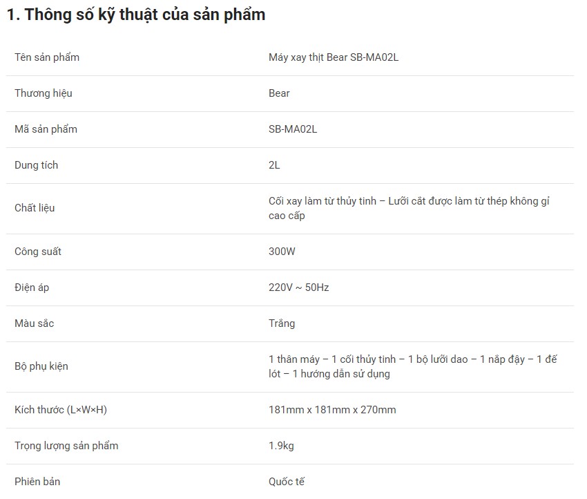 – Khả năng xay mạnh mẽ: Máy xay thịt Bear 2L SB-MA02L được trang bị công suất lên tới 300W, cho phép xay thực phẩm một cách dễ dàng và hiệu quả. Bạn không cần phải lo lắng về việc sử dụng dao, thớt hay phương pháp băm thịt truyền thống mất thời gian và công sức nữa. Với máy xay này, bạn có thể tự tin thể hiện khả năng nấu nướng đa dạng, từ các bữa ăn gia đình đến các buổi họp mặt, từ ẩm thực phương Đông đến ẩm thực phương Tây.