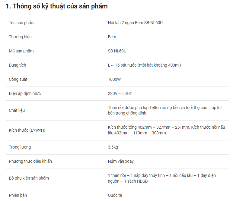 Nồi SB-NL60U có dung tích 6L tương đương với khoảng 15 bát nước (mỗi bát 400ml), thích hợp dùng cho khoảng 4 – 8 người. Với dung tích 6L, nồi lẩu Bear luôn đảm bảo có đủ không gian để thêm nước lẩu và các nguyên liệu cần thiết khác mà không bị quá tải. Bạn hoàn toàn có thể thưởng thức nhiều món ăn khác cùng gia đình và bạn bè một cách thoải mái nhất.