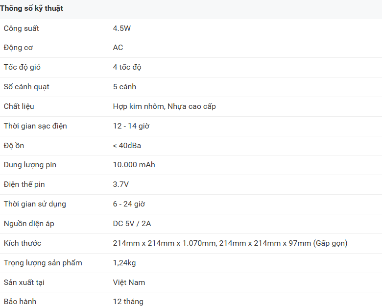 Với dung lượng pin 10.000 mAh chiếc quạt này sẽ đáp ứng nhu cầu sử dụng lâu dài, cho thời gian chạy từ 6 đến 24 giờ tùy mức độ gió.
