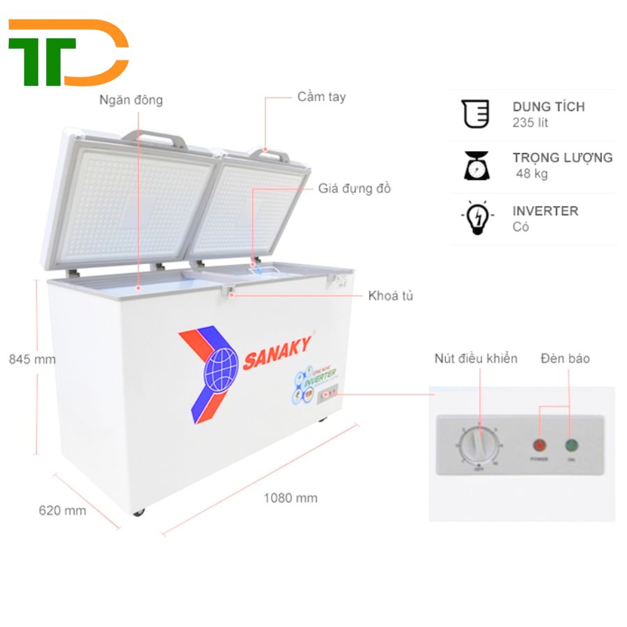 Tủ Đông Sanaky VH-2899A4K có thiết kế 1 ngăn đông rộng rãi với dung tích 235 lít, phù hợp cho gia đình, cửa hàng tiện lợi, quán ăn, nhà hàng. Tủ sử dụng 2 cánh mở giúp hạn chế thất thoát hơi lạnh, giảm tiêu hao điện năng khi lấy thực phẩm. Ngoài ra, tủ còn được trang bị giỏ đựng giúp sắp xếp thực phẩm gọn gàng và dễ dàng phân loại.